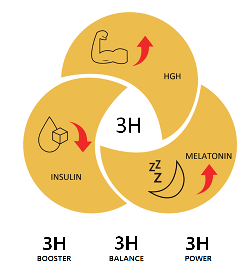 3H는  Health, Hope, and  Happiness를  상징하고  인체에서 가장 중요한 역할을 하는 3대 호르몬인  성장호르몬HGH, 인슐린Insulin, 멜라토닌Melatonin을 의미합니다.